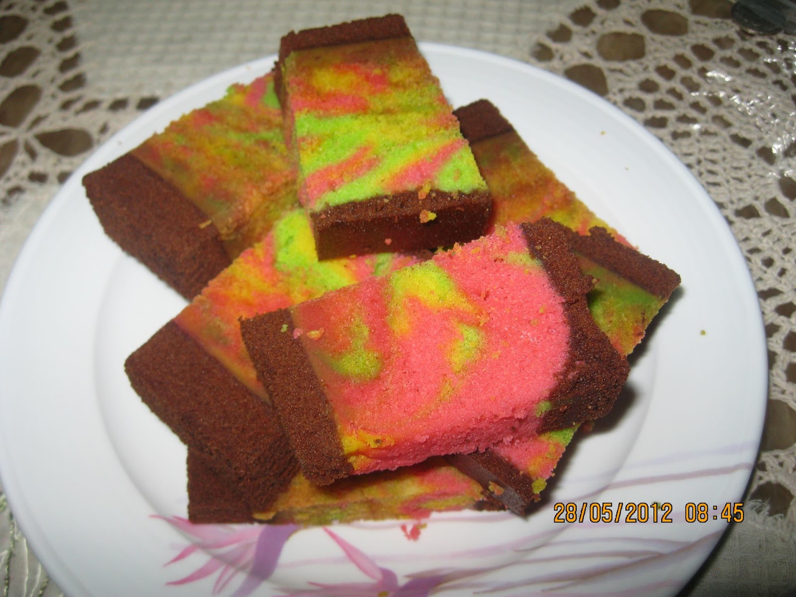 - bahagikan 6 bahagian-koko 2 bahagian,4 lagi:hijau-pandan,pink-strawberi,kuning-vanilla,purple-blueberi